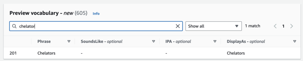 AWS Transcribe does offer custom vocabulary options where you can define specific terms, jargons, or product names (see attached image below). However, my experience showed this feature lacked effectiveness. Despite defining terminology in the custom vocab, errors were still prevalent.