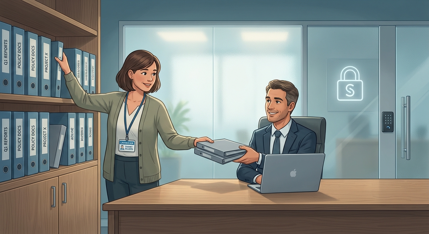 A smart librarian in a secure company library handing a business leader the right folder to answer a question.