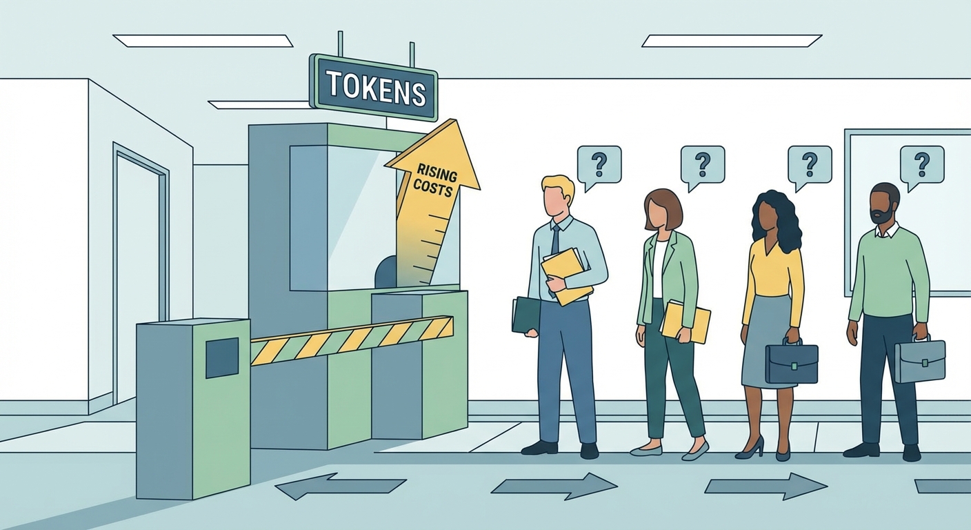 A line of office workers passing through a toll booth labeled 'Tokens' while a cost meter rises as they ask questions.